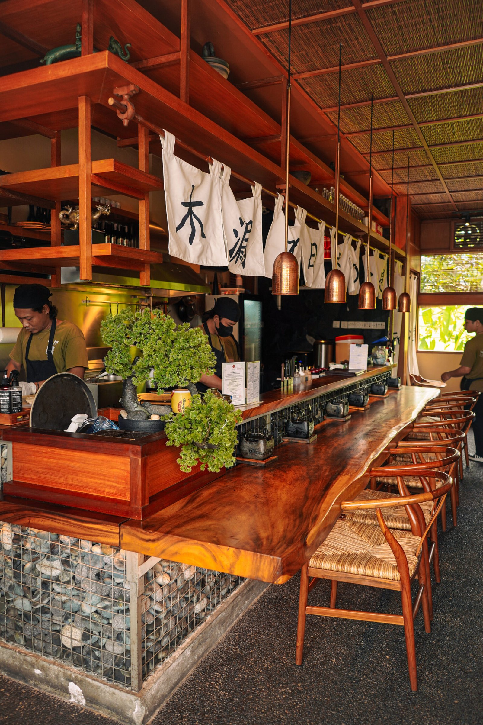 Warm wood tones, soft lighting, and minimalist Japanese elements create a calm and welcoming space.